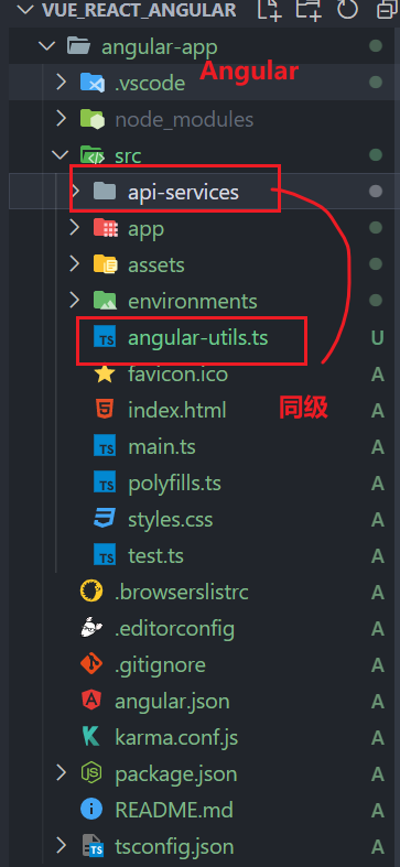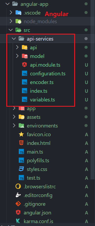 接着 打开你的 Angular 项目,并在 src 目录下创建 api-services 目录并将刚刚复制的目录文件放在里面。