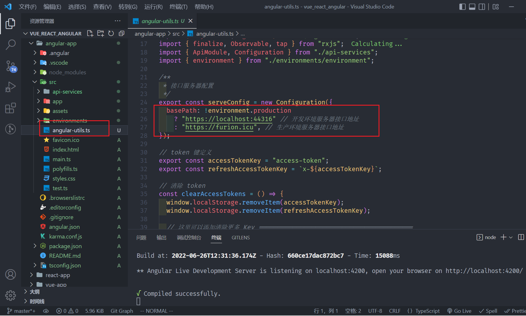 如果是 Angular 项目则编辑 Furion 框架提供的 angular-utils.ts 文件,并将 serveConfig 修改为对应的后端地址即可,如: