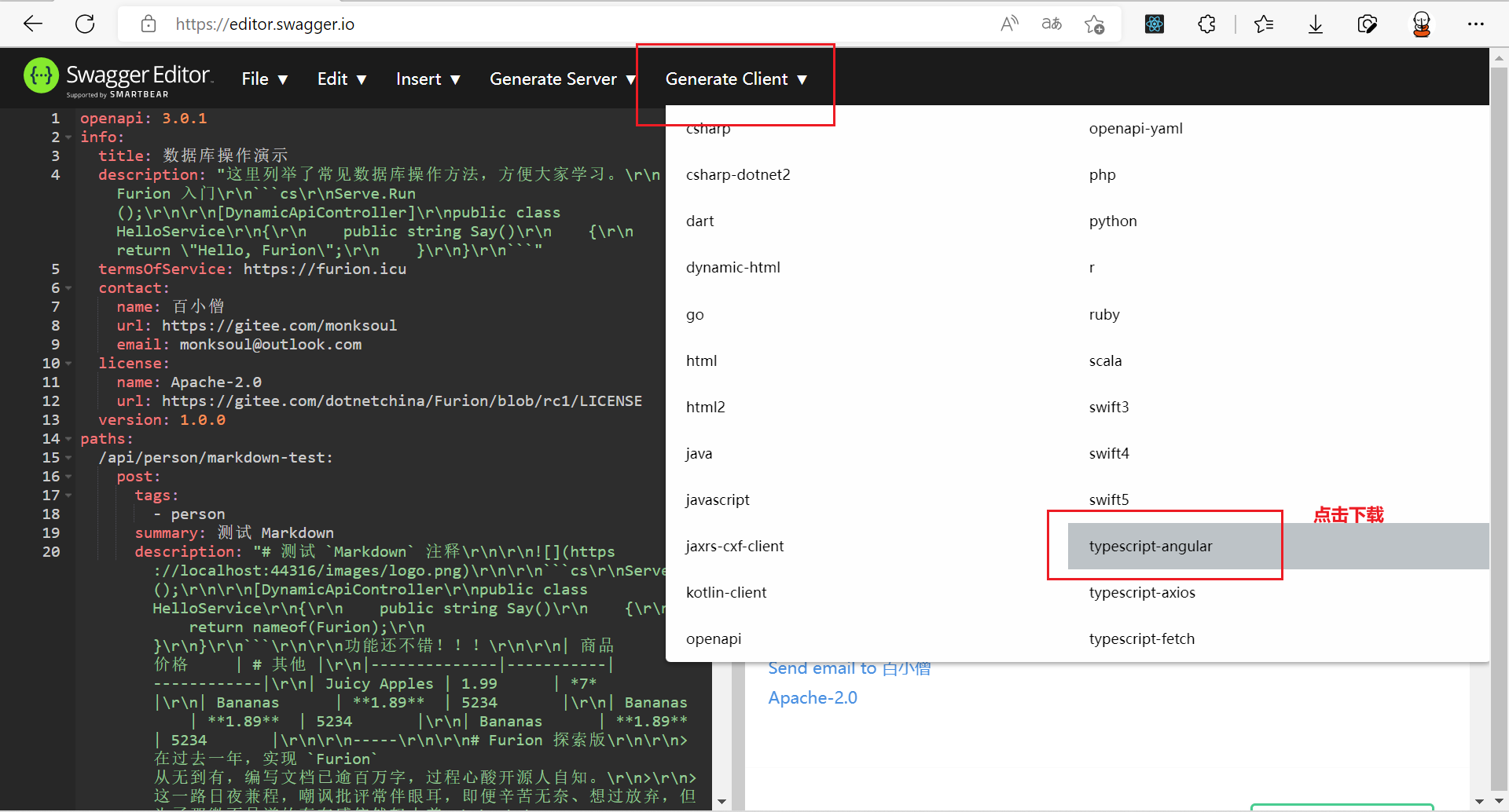 点击 Generate Client 顶部菜单并选择 typescript-angular 进行下载。