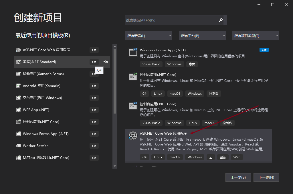 • 打开 Visual Studio 2019 并创建 Web 项目