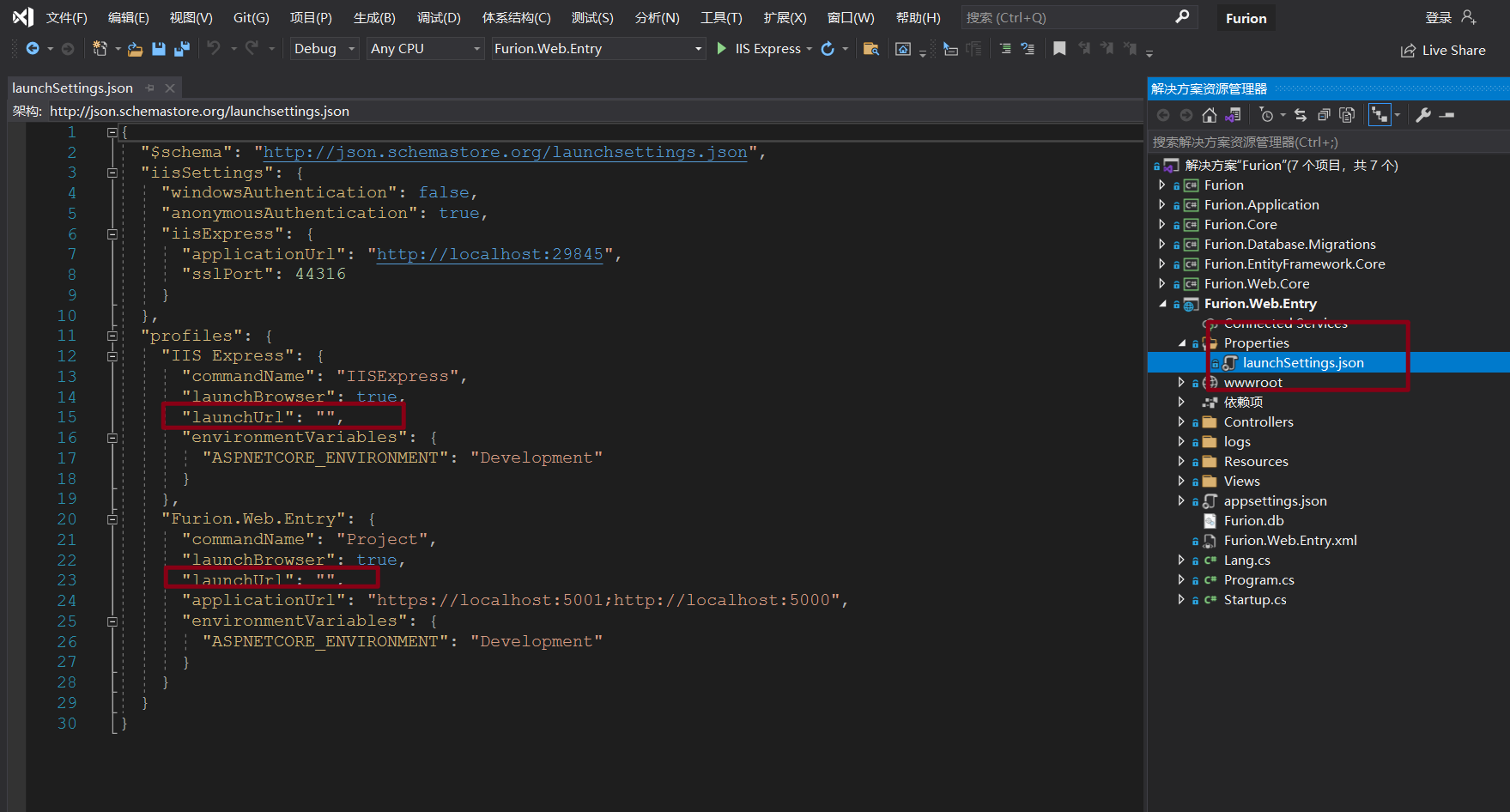 默认情况下,通过 Visual Studio 2019 创建的项目会自动配置了启动页,如果使用 F5 运行,可能不会自动打开首页,这时候我们只需要配置 launchSettings.jsonlaunchUrl 即可: