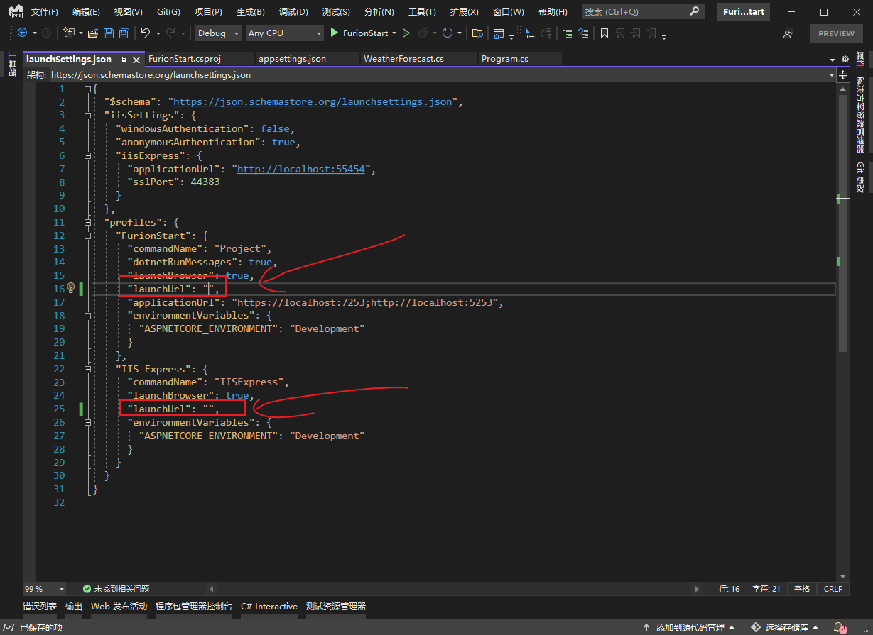 默认情况下,通过 Visual Studio 2022 创建的项目会自动配置了启动页,如果使用 F5 运行,可能不会自动打开首页,这时候我们只需要配置 launchSettings.jsonlaunchUrl 即可: