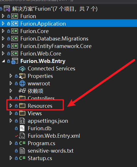 接下来在 Web启动项目层 添加 Resources 文件夹,如图:(可配置放置任意层,见配置 AssemblyName