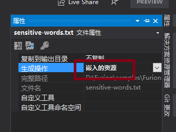 Web 启动层项目中创建 sensitive-words.txt 文件,确保采用 UTF-8 编码格式(Furion 4.8.6.7+ 支持 UTF8 BOM 编码格式) 且设置为嵌入式资源!