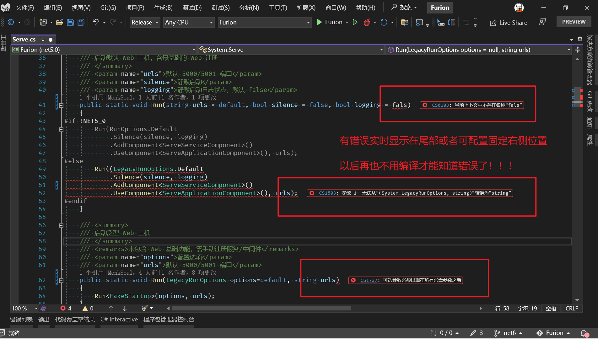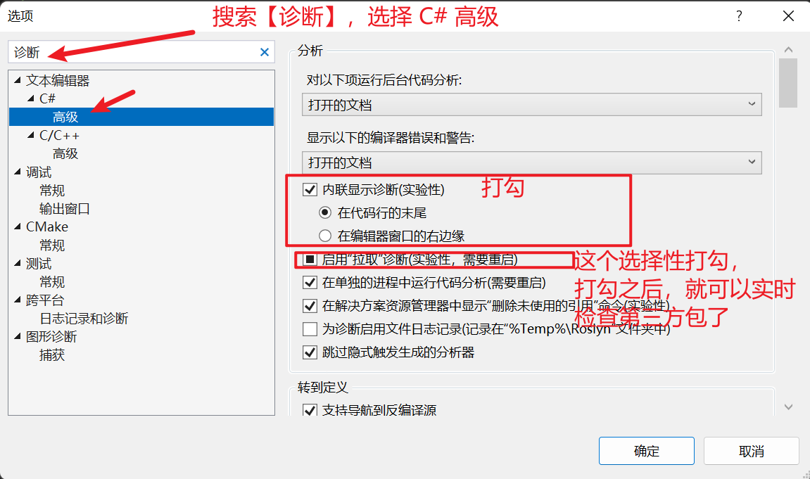 在过去,我们需要写完代码编译才能知道具体的错误,最新版的 Visual Studio 支持 内联诊断错误,开启如下: