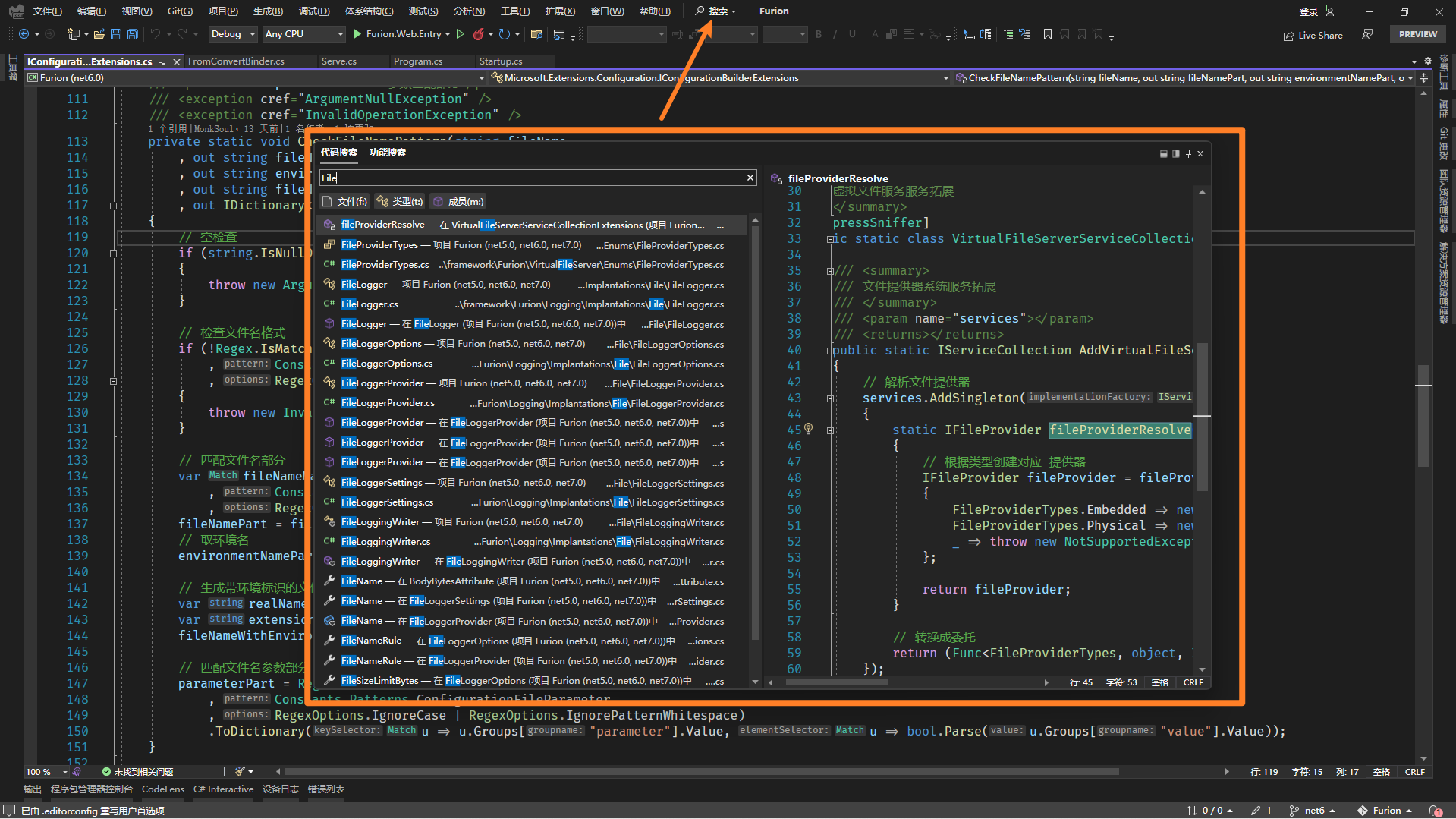 Visual Studio 2022 提供了非常强大的 代码搜索和功能搜索,只需要快捷键 Ctrl + QCtrl + T 呼出,如: